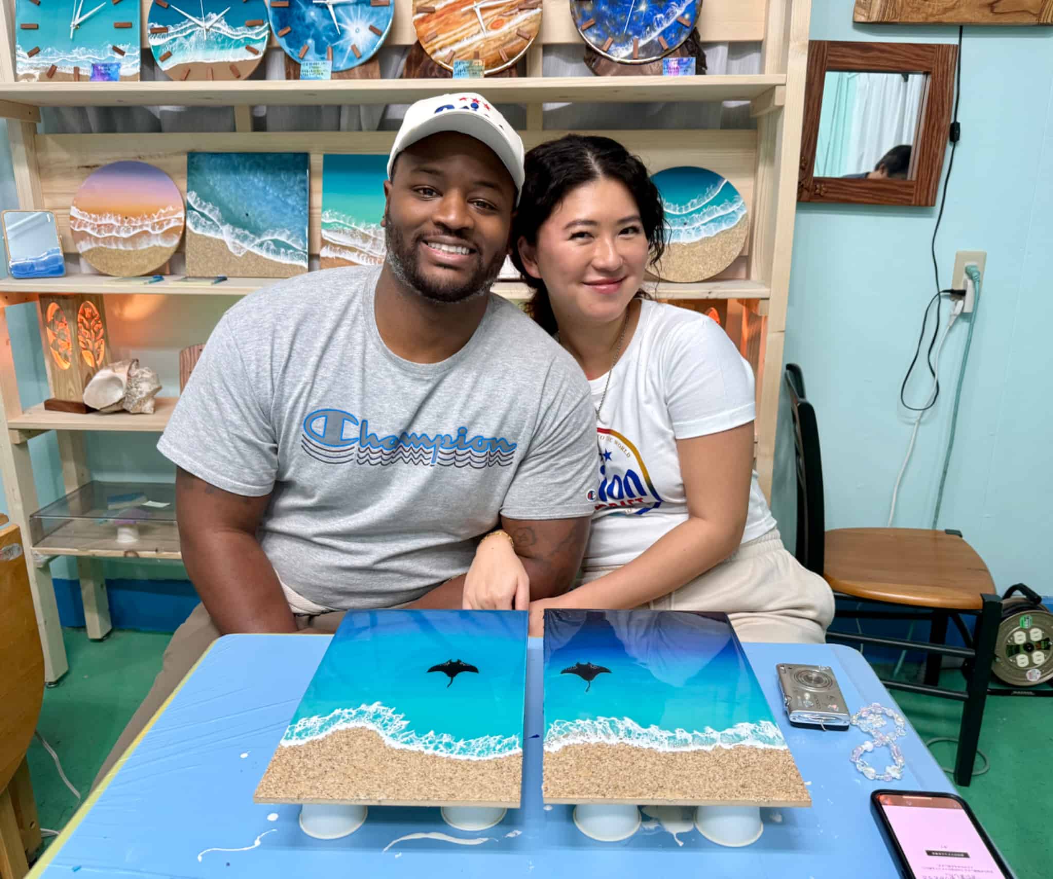 石垣島での【思い出】を形にして持ち帰りませんか? このプランでは500円でお席を確保できます! 独自でカットしているからこの価格! お子様にも大人気です!食卓に癒しを!✨ レジンアート体験に参加することで思い出に残る体験と自身で見た美しい海を描いて持ち帰ることができます! 一生の思い出になること間違いなしです! ⭐️体験時間は30分〜⭐️ ①10:00〜②11:30〜③12:30〜④13:30〜⑤14:30〜⑥15:30〜⑦16:30〜 ⭐️丁寧なレクチャー⭐️ 筆の使い方や色合いの相談など、細かな事まで丁寧にレクチャーをしますので絵に自信のない方や上手くできるか不安な方もご安心を!ご必要であれば満足頂ける作品に仕上げるお手伝いを全力でさせて頂きます! ⭐️石垣島鍾乳洞で開催⭐️ セットで鍾乳洞に行ける他、島料理の食堂やブルーシール(アイス)を食べれる店舗があります。また島のお土産もあり、品揃えも豊富です!半日は鍾乳洞で過ごす事ができます! ⭐️雨の日おすすめ⭐️ アクティビティが出来なくなることや観光地へのドライブもしづらくなるため特にオススメです! ⭐️近年大流行⭐️ SNSで大流行しているため見たことがある方も多いかと思います!石垣島でも人気な体験となっています! ⭐️家族・カップル・女性大歓迎⭐️ 老若男女楽しめる体験になっています!大人数での参加も歓迎していますのでご連絡下さい! ⭐️ レジンアート体験は参加者の99%が初心者⭐️ 誰でも作ることができます!できるか不安な方でも満足して帰られてます!✨ 「島人の職人」が【1時間半】丁寧にレクチャーします!お客様に“大満足でした!”と言って頂けることが多くなり、また部屋に飾っている写真を送って頂けることも多くやりがいを感じています! お客様の声を聞き【満足度を1番に考える】体験内容を実現します‼️ 思い出を形にできるのがレジンアートです! 石垣島の思い出に【レジンアート体験】いかがでしょうか? ☆レジンについて☆ 今回使用するレジンはエポキシレジンです。 2つの液体を混ぜ合わせて化学反応で硬化します。硬化には時間がかかります。 透明度が高く光沢があり高級感のある仕上がりになる液体です。 ☆主な材料☆ アートボード、アクリル絵の具、レジン液 ☆店主☆ 石垣島の海を愛し、島木を使った作品を表現してきました。また、初めてレジンアートと出会った時に、こんなにも海をリアルに描けるアートがあるのかと感銘を受け、気づけばレジンアートの虜になってしまいました。この素晴らしい体験を多くの方々に経験して頂きたいと思い、体験教室を始めました!これからもお客様にたくさんの【思い出】を作って頂けるよう精進して参ります!