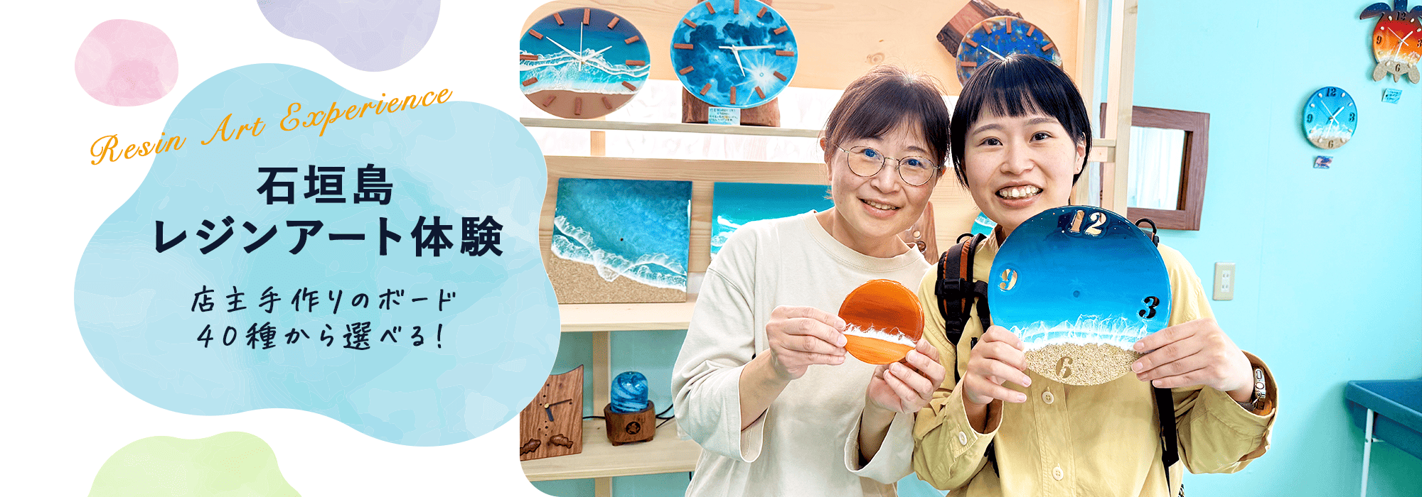 石垣島での【思い出】を形にして持ち帰りませんか? このプランでは円形時計を作ることができます! 飾る時計が自身で作ったレジンアートだったら素敵じゃないですか✨ 実用性があり、思い出を毎日確認することができます!✨ 貝を使って時計の数字代わりに組み込むことができます!(貝の種類は変わることがあります。) レジンアート体験に参加することで思い出に残る体験と自身で見た美しい海を描いて持ち帰ることができます! 一生の思い出になること間違いなしです! ⭐️料金⭐️ 20㎝丸時計 12000円 30㎝丸時計 16000円 (30cm時計は数字がカットされているボード、または、カットせずに木や貝殻を数字代わりにするボードの2種類から選べます!) ⭐️体験時間は1時間30分⭐️ ①10:00〜②12:30〜③14:30〜④16:00 ⭐️丁寧なレクチャー⭐️ 筆の使い方や色合いの相談など、細かな事まで丁寧にレクチャーをしますので絵に自信のない方や上手くできるか不安な方もご安心を!ご必要であれば満足頂ける作品に仕上げるお手伝いを全力でさせて頂きます! ⭐️石垣島鍾乳洞で開催⭐️ セットで鍾乳洞に行ける他、島料理の食堂やブルーシール(アイス)を食べれる店舗があります。また島のお土産もあり、品揃えも豊富です!半日は鍾乳洞で過ごす事ができます! ⭐️雨の日おすすめ⭐️ アクティビティが出来なくなることや観光地へのドライブもしづらくなるため特にオススメです! ⭐️近年大流行⭐️ SNSで大流行しているため見たことがある方も多いかと思います!石垣島でも人気な体験となっています! ⭐️家族・カップル・女性大歓迎⭐️ 老若男女楽しめる体験になっています!大人数での参加も歓迎していますのでご連絡下さい! ⭐️ レジンアート体験は参加者の99%が初心者⭐️ 誰でも作ることができます!できるか不安な方でも満足して帰られてます!✨ 「島人の職人」が【1時間半】丁寧にレクチャーします!お客様に“大満足でした!”と言って頂けることが多くなり、また部屋に飾っている写真を送って頂けることも多くやりがいを感じています! お客様の声を聞き【満足度を1番に考える】体験内容を実現します‼️ 思い出を形にできるのがレジンアートです! 石垣島の思い出に【レジンアート体験】いかがでしょうか? ☆レジンについて☆ 今回使用するレジンはエポキシレジンです。 2つの液体を混ぜ合わせて化学反応で硬化します。硬化には時間がかかります。 透明度が高く光沢があり高級感のある仕上がりになる液体です。 ☆主な材料☆ アートボード(200mm✖︎150mm)、アクリル絵の具、レジン液 ☆店主☆ 石垣島の海を愛し、島木を使った作品を表現してきました。また、初めてレジンアートと出会った時に、こんなにも海をリアルに描けるアートがあるのかと感銘を受け、気づけばレジンアートの虜になってしまいました。この素晴らしい体験を多くの方々に経験して頂きたいと思い、体験教室を始めました!これからもお客様にたくさんの【思い出】を作って頂けるよう精進して参ります!