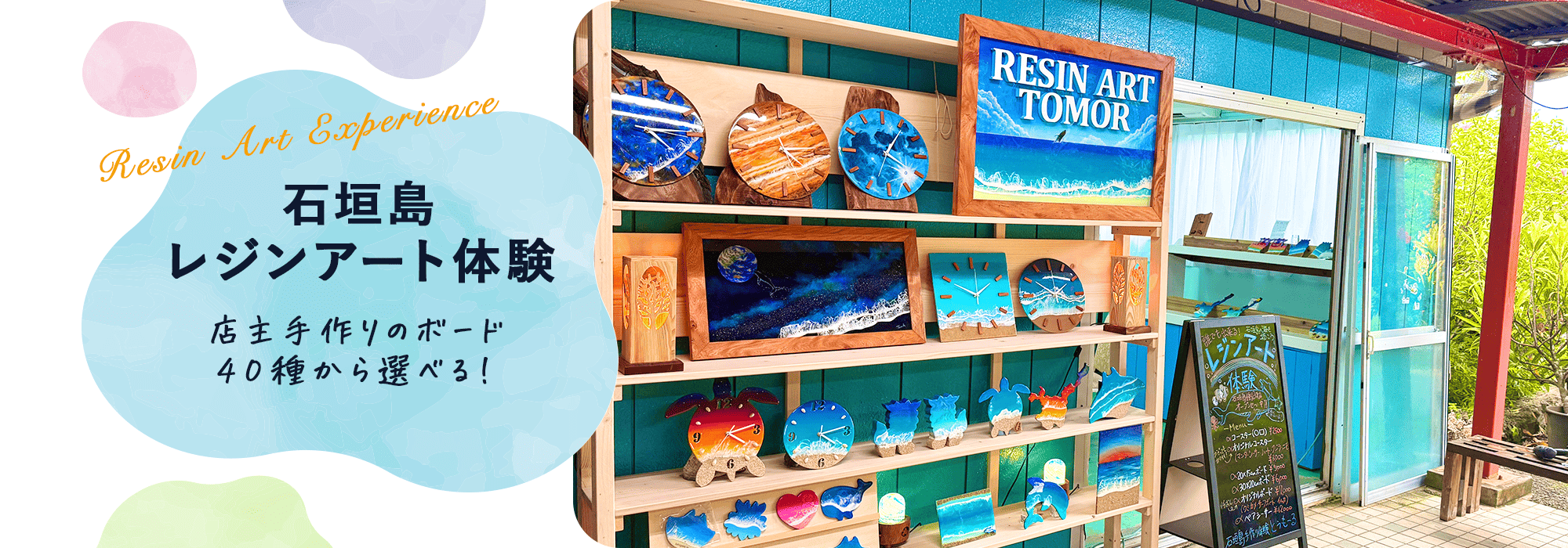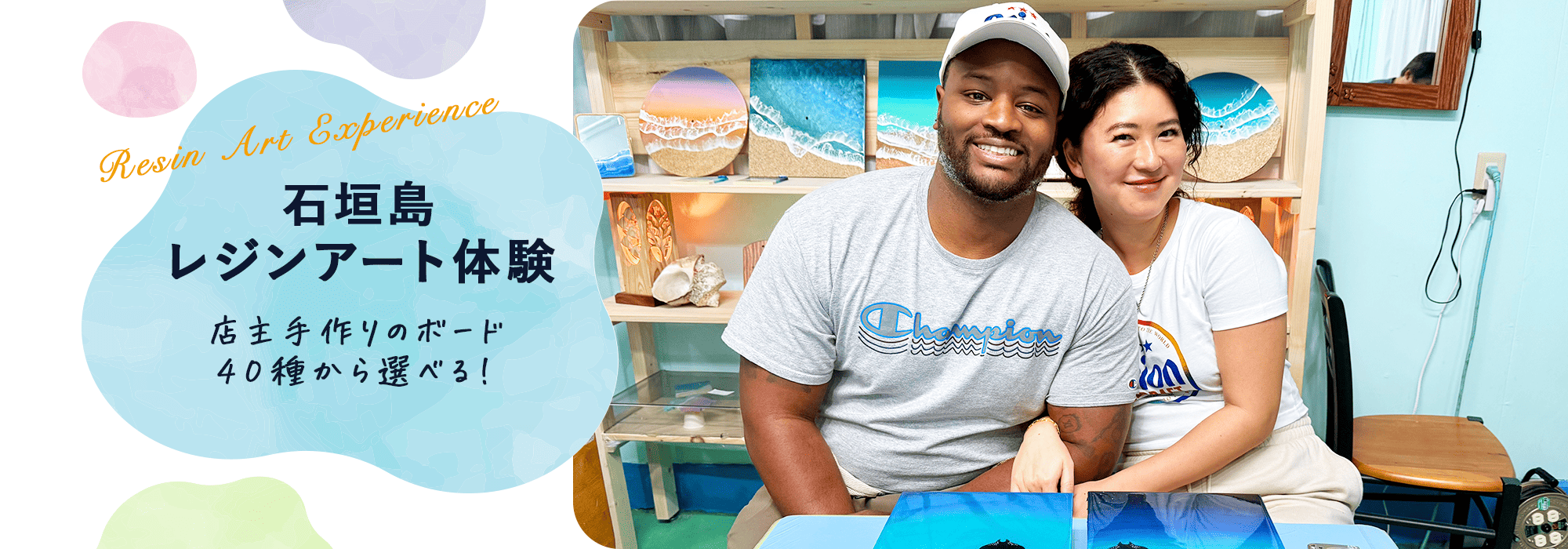 石垣島での【思い出】を形にして持ち帰りませんか? サーフボード、石垣島ボード、ウミガメ、マンタなどさまざまなボードを選ぶことができます! 独自でカットしているのでこの価格で提供できます!✨ デザインやカットにこだわっています!他にない形です! 飾るだけで雰囲気が明るくなります✨ レジンアート体験に参加することで思い出に残る体験と自身で見た美しい海を描いて持ち帰ることができます! 一生の思い出になること間違いなしです! ⭐️体験時間は1時間30分⭐️ ①10:00〜②12:30〜③14:30〜④16:30 ⭐️丁寧なレクチャー⭐️ 筆の使い方や色合いの相談など、細かな事まで丁寧にレクチャーをしますので絵に自信のない方や上手くできるか不安な方もご安心を!ご必要であれば満足頂ける作品に仕上げるお手伝いを全力でさせて頂きます! ⭐️石垣島鍾乳洞で開催⭐️ セットで鍾乳洞に行ける他、島料理の食堂やブルーシール(アイス)を食べれる店舗があります。また島のお土産もあり、品揃えも豊富です!半日は鍾乳洞で過ごす事ができます! ⭐️雨の日おすすめ⭐️ アクティビティが出来なくなることや観光地へのドライブもしづらくなるため特にオススメです! ⭐️近年大流行⭐️ SNSで大流行しているため見たことがある方も多いかと思います!石垣島でも人気な体験となっています! ⭐️家族・カップル・女性大歓迎⭐️ 老若男女楽しめる体験になっています!大人数での参加も歓迎していますのでご連絡下さい! ⭐️ レジンアート体験は参加者の99%が初心者⭐️ 誰でも作ることができます!できるか不安な方でも満足して帰られてます!✨ 「島人の職人」が【1時間半】丁寧にレクチャーします!お客様に“大満足でした!”と言って頂けることが多くなり、また部屋に飾っている写真を送って頂けることも多くやりがいを感じています! お客様の声を聞き【満足度を1番に考える】体験内容を実現します‼️ 思い出を形にできるのがレジンアートです! 石垣島の思い出に【レジンアート体験】いかがでしょうか? ☆レジンについて☆ 今回使用するレジンはエポキシレジンです。 2つの液体を混ぜ合わせて化学反応で硬化します。硬化には時間がかかります。 透明度が高く光沢があり高級感のある仕上がりになる液体です。 ☆主な材料☆ アートボード(200mm✖︎150mm)、アクリル絵の具、レジン液 ☆店主☆ 石垣島の海を愛し、島木を使った作品を表現してきました。また、初めてレジンアートと出会った時に、こんなにも海をリアルに描けるアートがあるのかと感銘を受け、気づけばレジンアートの虜になってしまいました。この素晴らしい体験を多くの方々に経験して頂きたいと思い、体験教室を始めました!これからもお客様にたくさんの【思い出】を作って頂けるよう精進して参ります!